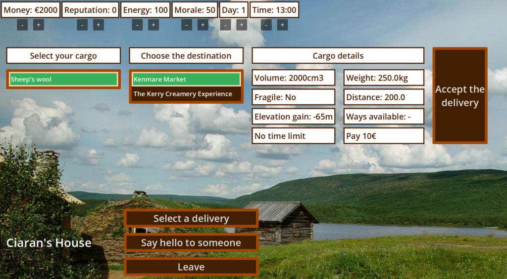 The game I am making is quite simple. It’s a transporation management sim inspired by 1987 Ports of Call. The game will basically allow you to load cargo, journey to its destination and get paid for moving that cargo. You will also be able to talk to people along the way. With the ressource you acquire, you make youself a living. All this is done mostly through UI (user interface – fields, buttons, printed texts), That’s all.